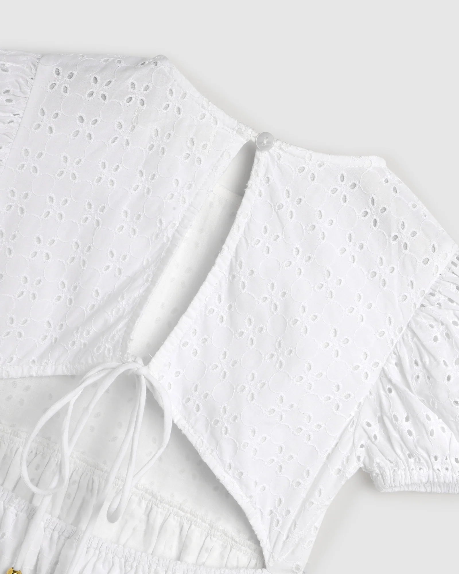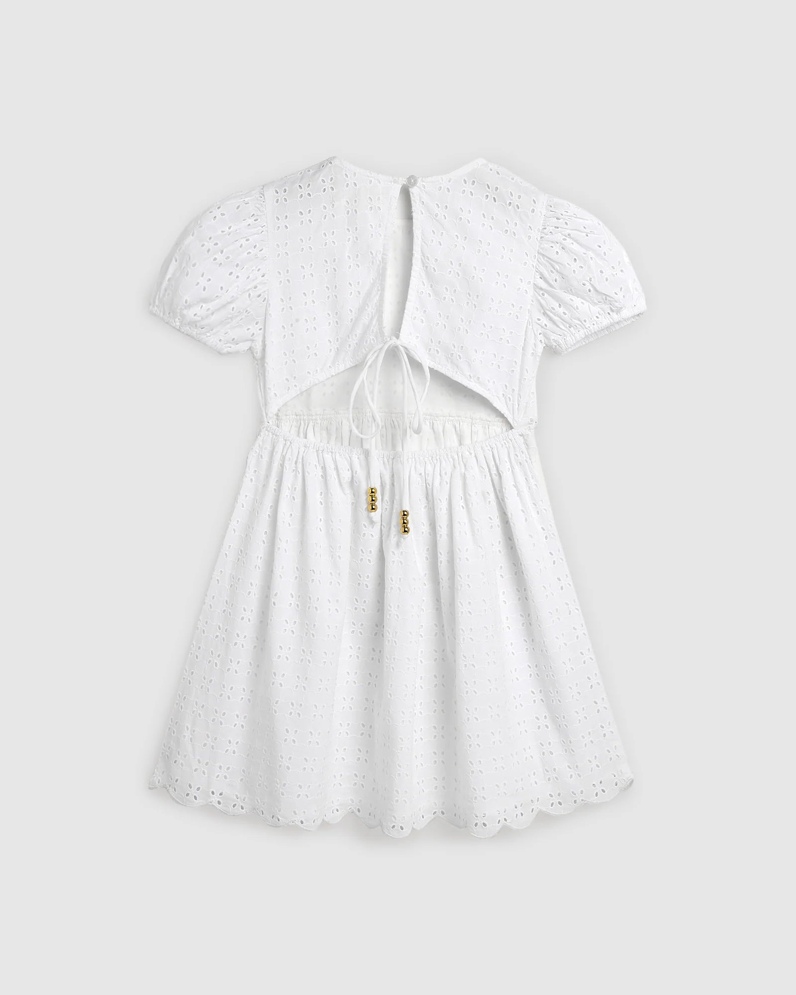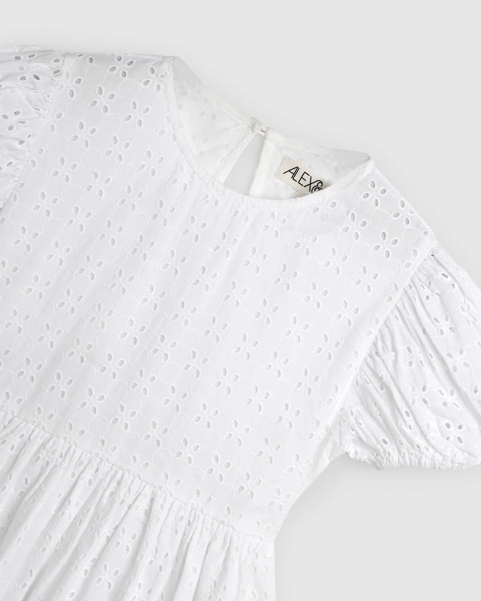 The Aria Dress in White is a delicate and whimsical piece, perfect for special occasions and celebrations. Designed with sweet puff sleeves and a gathered skirt, the Aria Dress offers an elegant silhouette that’s perfect for twirling and capturing magical moments. The little gold beads are so divine. Made from the softest highest quality cotton anglaise. Lightweight and breathable, it ensures comfort without compromising on style.