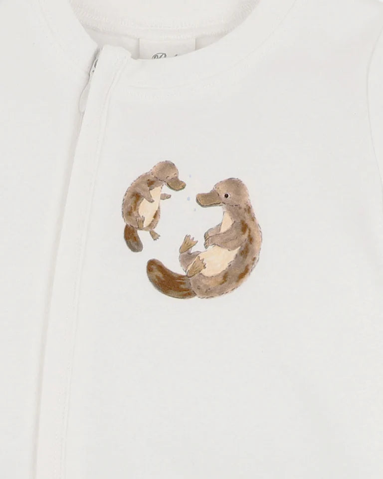 Inspired by Australia's unique wildlife, this sweet Platypus Zipsuit is made from beautifully soft Organic Cotton, perfect for keeping your little one comfy on warm days. Featuring a textural hand-illustrated platypus parent and baby motif on a soft cloud base, it offers a gentle, gender-neutral look with a distinctly Australian charm. Thoughtfully designed with a full-length side zip for easy dressing and soft short sleeves, this romper is both practical and playful-perfect for everyday wear, gifting, or welcoming a new arrival. • Made from 100% Organic Cotton - soft, breathable and gentle on delicate skin • Hand-drawn textural platypus parent and baby print • Short sleeves for warm-weather comfort • Full-length side zip for quick and easy changes