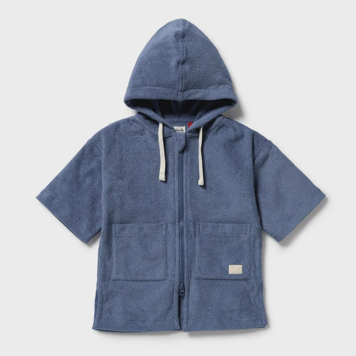 Keep your little one warm and dry after a splash with our super absorbent deep blue hooded towel. Made from soft organic cotton terry towelling, it’s cosy and perfect for summer adventures. With a zip-up front and two handy patch pockets, it’s easy to pop on after the beach or pool – making change time quick, comfy, and cute. Key Features: Mid length. Functional pockets. 2 way zipper for easy dressing. Relaxed fit. Packaged in a bio-degradable bag. Details: 100% GOTS-certified organic cotton. Certified by: Ecocert, EGL 212333. Machine washable. Made in India.