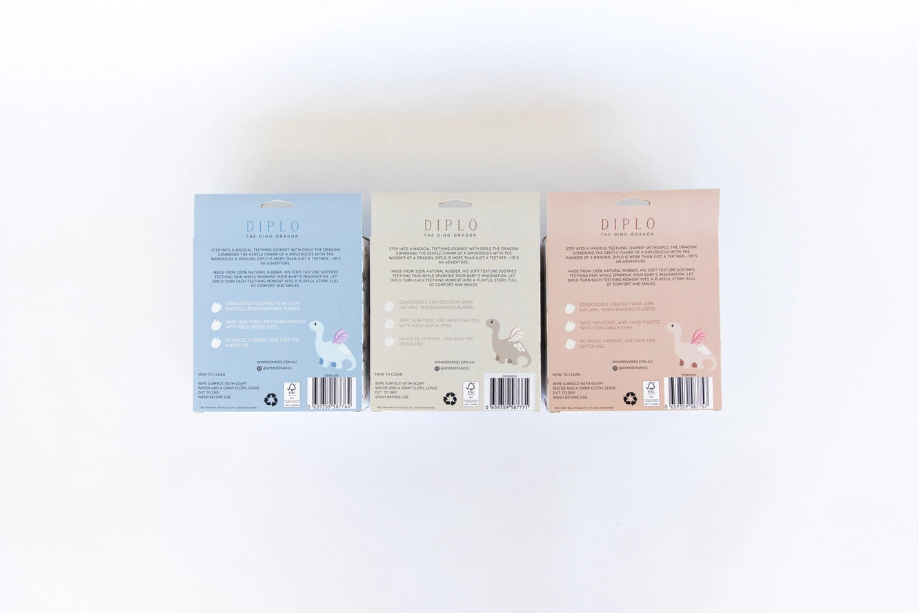 Step into a world where teething turns into a magical journey with Diplo the Dragon! Diplo, a whimsical creation with a blend of a gentle diplodocus and a mythical dragon. Diplo is more than just a teether — he’s a magical journey to find comfort and enchantment. Hold Diplo’s winding neck to chew on his soft prehistoric head, a tail to help reach further back into the mouth and 4 legs to offer more sold chewing support. We’ve taken care of the important things, so you can focus on making memories. Diplo the Dino-Dragon is extremely eco-friendly, biodegradable 100% natural rubber with no holes, meaning no internal mould build up. Ready in a gorgeous giftable box, Diplo is designed by an Australian mum who is no stranger to the teething journey. Each Dino is created and painted by hand with natural food grade pigments. Suitable from birth to create connection, ready to hold from around 4+ months!