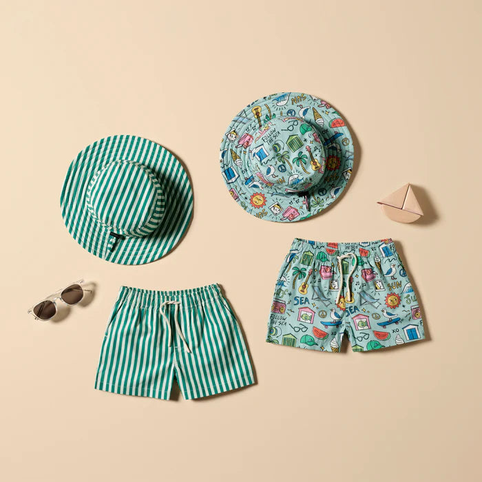 Perfect for summer adventures, this green bean stripe cotton board shorts are a must-have for beach days and poolside fun. Made from 100% breathable cotton, these boys’ swim shorts feature an all-over stripe print and a soft elastic waistband for all-day comfort. Ideal for active little ones who love the sun, surf, and sand. Key Features: Made from 100% Cotton. Soft elasticated waistband with adjustable ties. Packaged in a bio-degradable bag. Details: Fabric: 100% Cotton. Machine washable. Made in India.