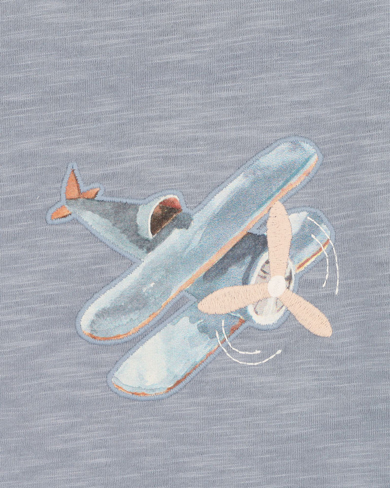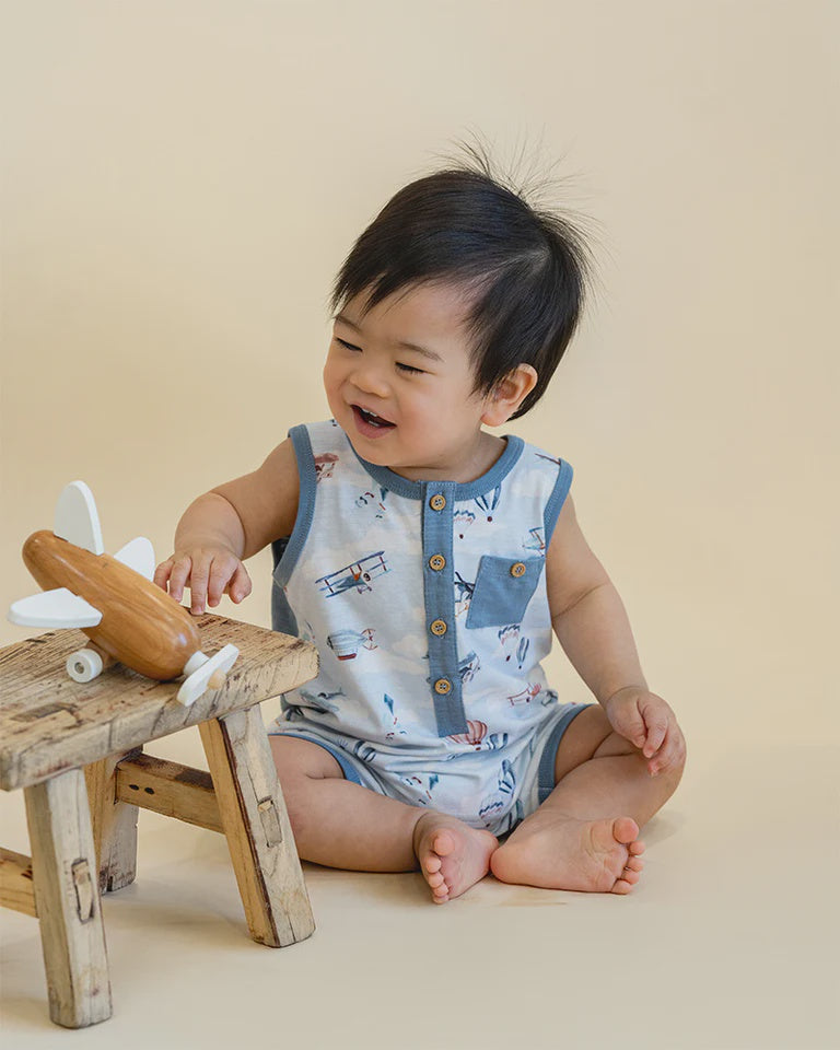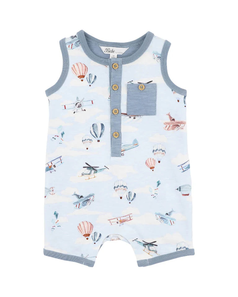 This playful little playsuit is made for sky-high adventures. With a whimsical all-over print of planes and hot air balloons on the front, and a striking placement applique on the back, it's perfect for curious little dreamers. Crafted from soft cotton elastane at the front and comfy 100% cotton on the back, it's designed for ease of movement and all-day comfort. • Front: 95% cotton 5 elastane • Back: 100% cotton • All-over sky print with contrast placement artwork at back • Wooden-look button front opening • Contrast patch pocket at chest • Crotch press studs for fuss-free changes • Soft rib binding at neck, arms and legs for comfort and fit
