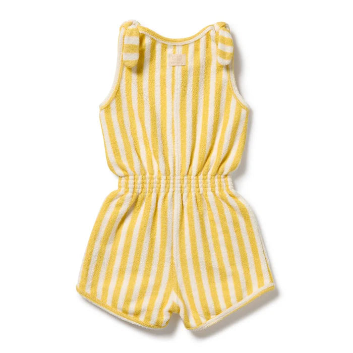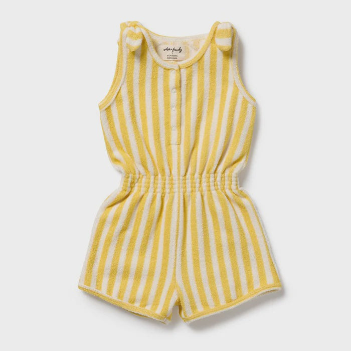 Made from soft and absorbent GOTS-certified organic cotton terry, this kids' playsuit is perfect for beach days, poolside fun, and sunny summer adventures. Designed as an easy throw-on over bathers, it features a playful two-tone honey wave stripe, a comfy shirred waist, and fixed shoulder straps with cute mock tie details. The front snap opening makes dressing a breeze, while the breathable terry towelling fabric keeps kids cool and comfy after a swim. A summer essential for your little beach lover. Key Features: Soft, absorbent fabric – perfect for post-swim wear. Soft, absorbent fabric – perfect for summer. Fixed shoulder straps with mock tie detail. Comfy shirred waist for a flexible fit. Snap opening at front for easy dressing. Made with GOTS-certified organic cotton. Sustainably produced. Packaged in a bio-degradable bag. Details: 100% GOTS-certified organic cotton. Certified by: Ecocert, EGL 212333. Machine washable. Made in India.