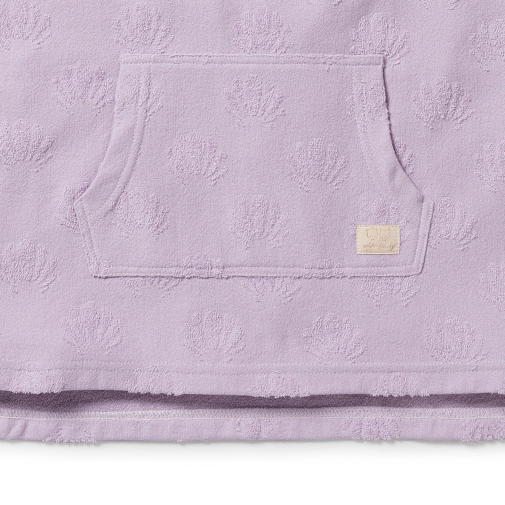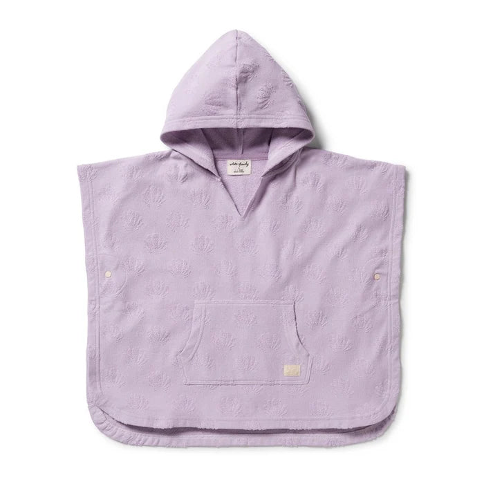 Wrap your little one in comfort after a splash with our cosy hooded poncho towel, featuring a beautiful lavender shells all-over jacquard pattern. Made from soft, absorbent cotton, it includes a handy hood to keep them warm and dry after beach days or poolside fun. Perfect for post-swim snuggles and sunny summer adventures. Key Features: Mid length. Functional pockets. Side snap button. Relaxed fit. Packaged in a bio-degradable bag. Details: 100% GOTS-certified organic cotton. Certified by: Ecocert, EGL 212333. Machine washable. Made in India.