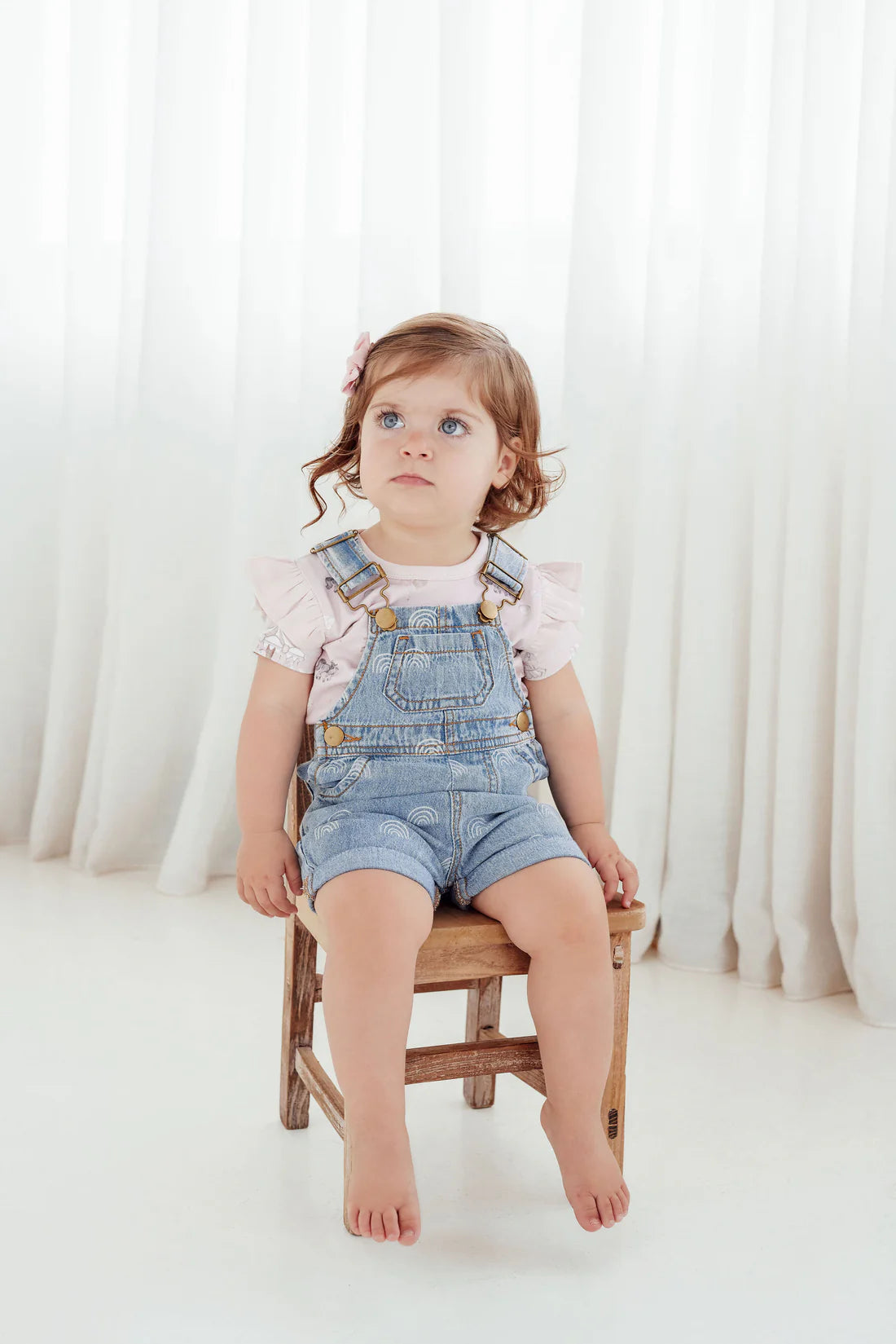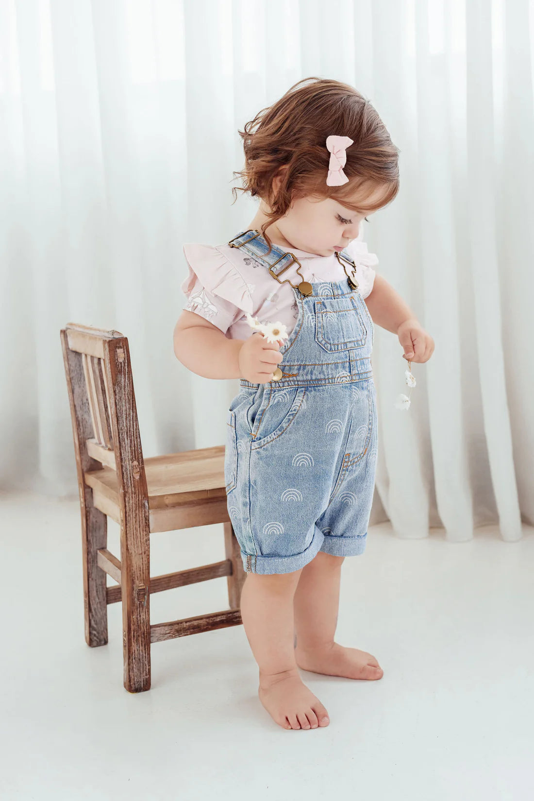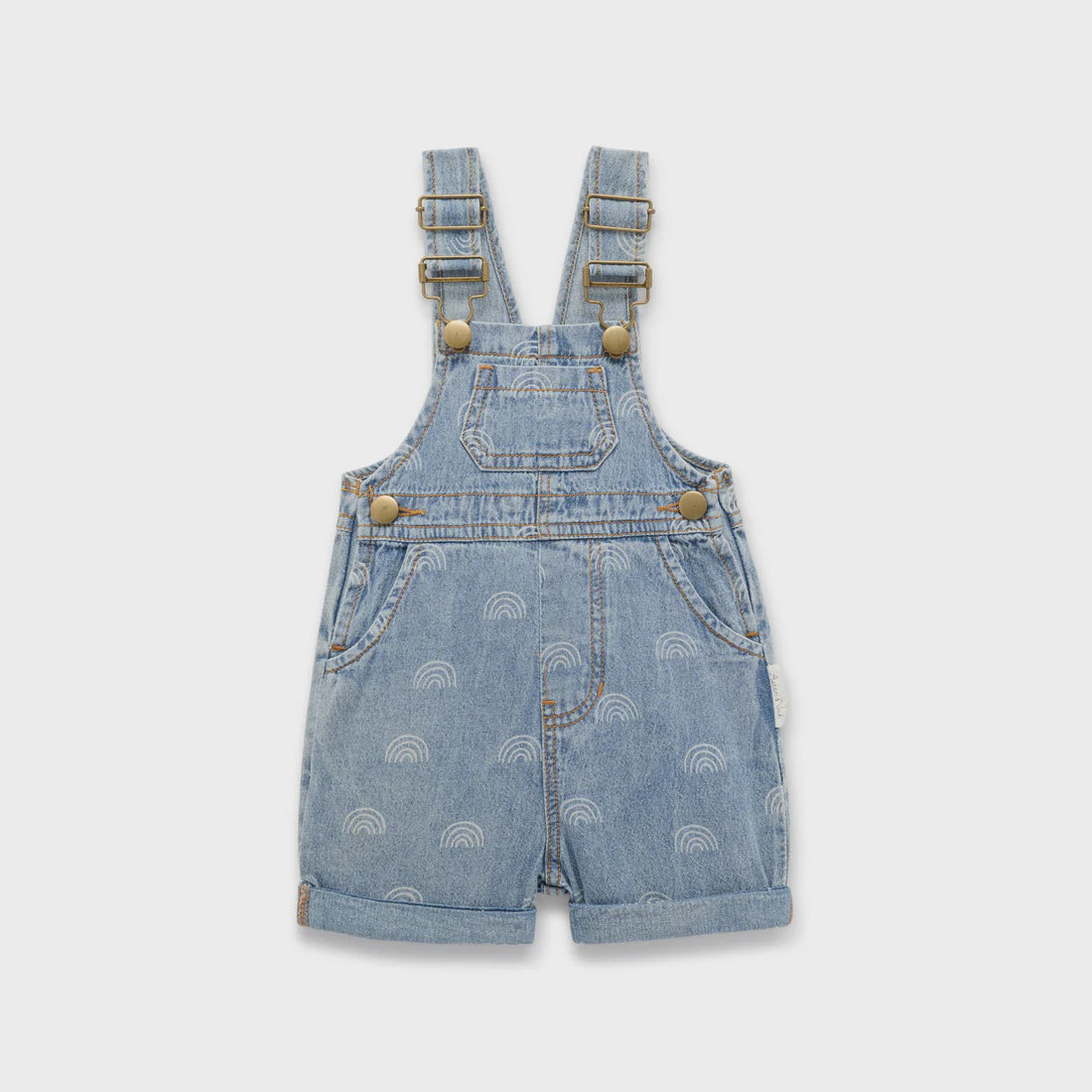 Crafted in our soft and breathable light denim, these Rainbow Overalls are a playful everyday essential designed for comfort and versatility. Featuring a delicate all-over white rainbow design on a pale blue base, they bring a gentle, joyful touch to your little one's wardrobe.