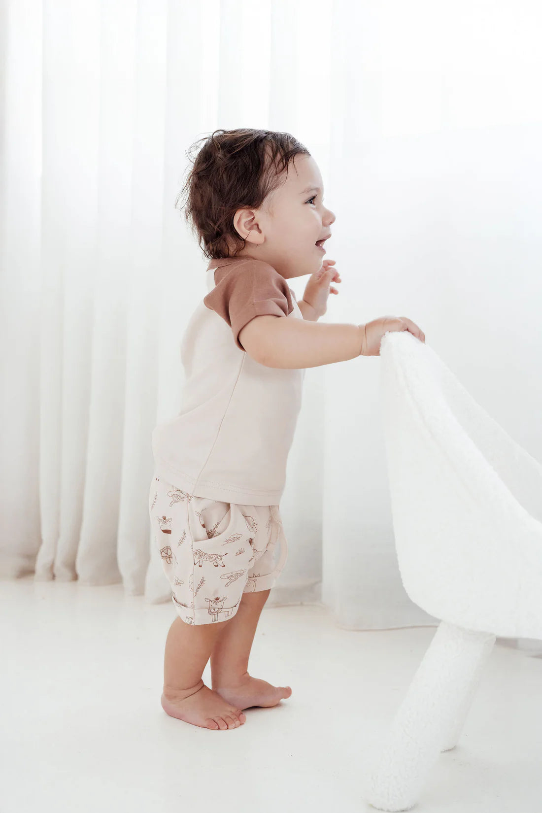 Crafted from luxuriously soft GOTS-certified organic cotton, this tee features an embroidered lion motif on the chest and a warm, earthy colour-block design. The contrasting sleeves add a touch of style and charm, while the side button fastening makes dressing quick and easy. Perfect for pairing with our Safari Adventure Shorts or under overalls, your little one will be ready to explore!