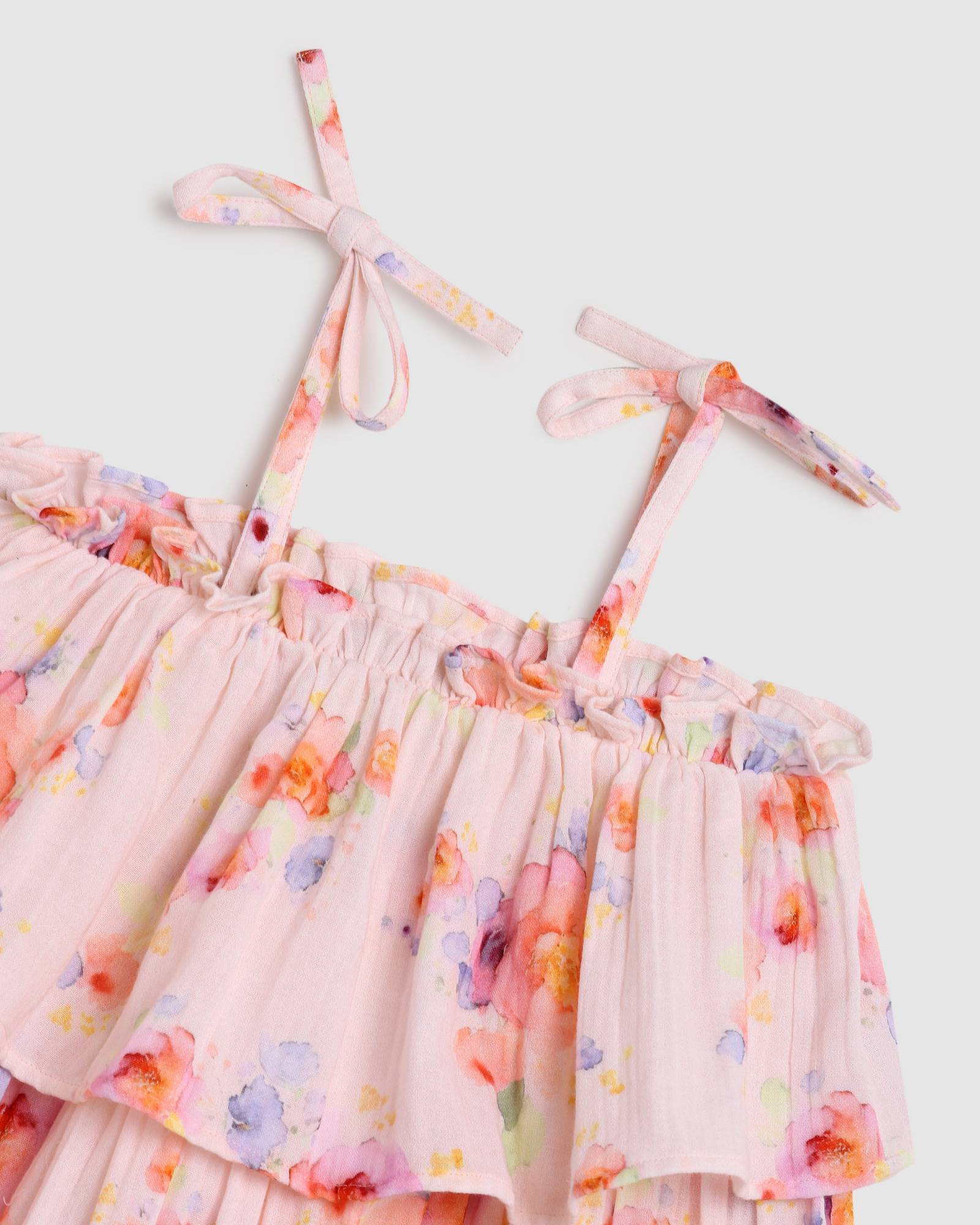 The Lucia Dress in Roses is a vibrant and playful design, perfect for sunny days and special occasions. Featuring adjustable tie straps and tiered ruffles adorned with our beautiful roses pattern, this dress is as fun as it is stylish.