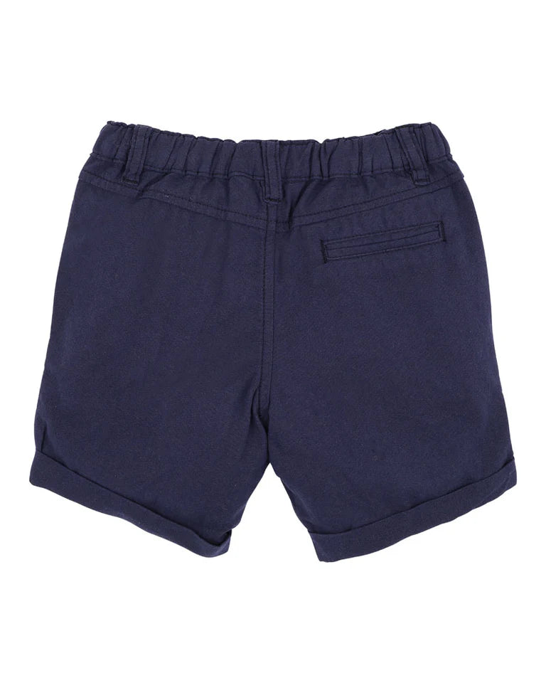 A timeless staple for every little wardrobe, these navy shorts are designed with comfort and versatility in mind. Whether he's heading to a family outing or just enjoying a play-filled day, these classic bottoms offer an easy-to-style option for any summer look. Pair with a crisp shirt or polo for a polished finish. • Soft cotton linen blend • Adjustable elastic waistband • Fly detail with button closure • Front slant pockets • Rolled cuff finish • Available in both baby and kids sizing for coordinated dressing