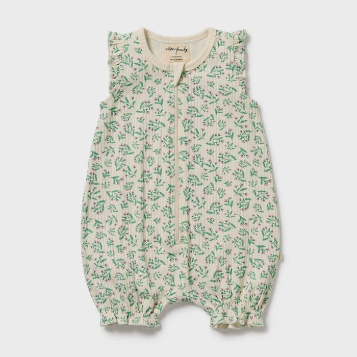 Keep your newborn comfy and cool in this adorable Wilson and Frenchy zipsuit. Made from GOTS-certified organic cotton, it’s gentle on delicate skin and features a hand-illustrated all-over print. Designed with a zip-down front for easy changes, ruffle cap sleeves for a sweet touch, and short legs with shirred openings for a comfy fit that’s perfect for warmer days. Key Features: Round neckline with concealed zipper for safety. Made from GOTS-certified organic cotton. Sustainably produced. Packaged in a bio-degradable bag. Details: 95% GOTS-certified organic cotton, 5 % elastane. Certified by: Ecocert, EGL 212333. Low fire danger - Complies to the AS, NZS 1249-2014 sleepwear standards. CAUTION - KEEP AWAY FROM HEAT AND FLAME. Machine washable. Made in India.