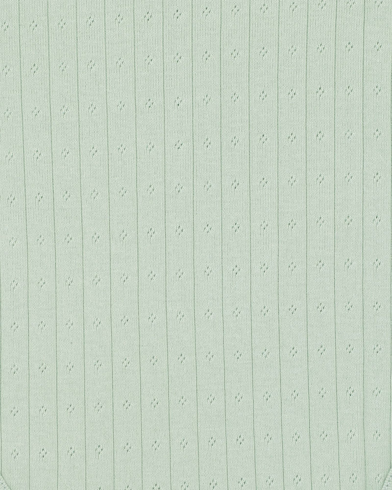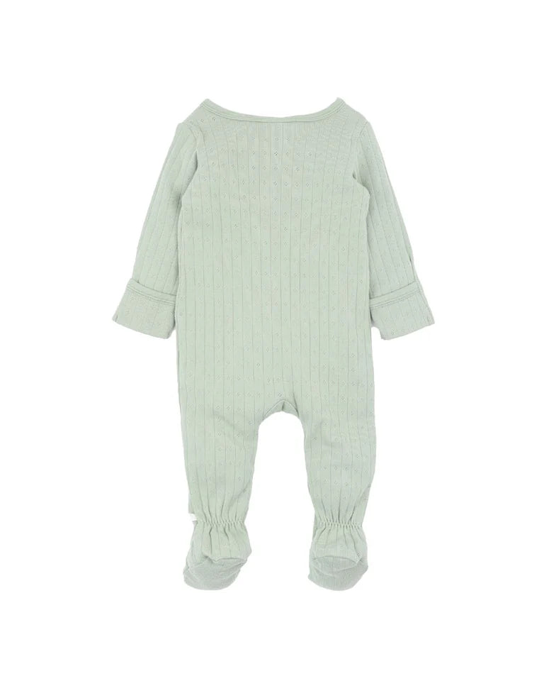 Wrap your little one in the softest comfort with our sage pointelle zipsuit-perfect for dreamy days and snuggly nights. Crafted from breathable organic cotton with a sweet all-over pointelle design, it's a timeless essential for every newborn wardrobe. Practical details like the full-length zipper, fold-over mittens and enclosed feet keep baby cozy and make dressing fuss-free. • 100% Organic Cotton • Delicate all-over pointelle texture • Full-length zip for easy changes • Safety fold at zip to protect young skin • Built-in fold-over mittens • Enclosed feet for extra warmth