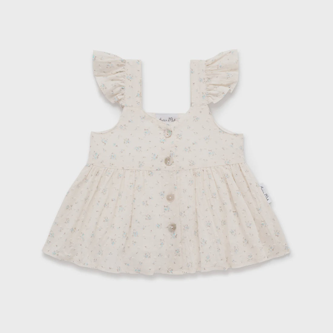 Featuring delicate florals with ruffled shoulder, complemented with a gorgeous flair fit, this top can be dressed up or down to suit any occasion. Lovingly crafted from all-natural dobby spot woven cotton, which adds texture whilst being light and breathable, making this a perfect addition to any sunny day outfit.