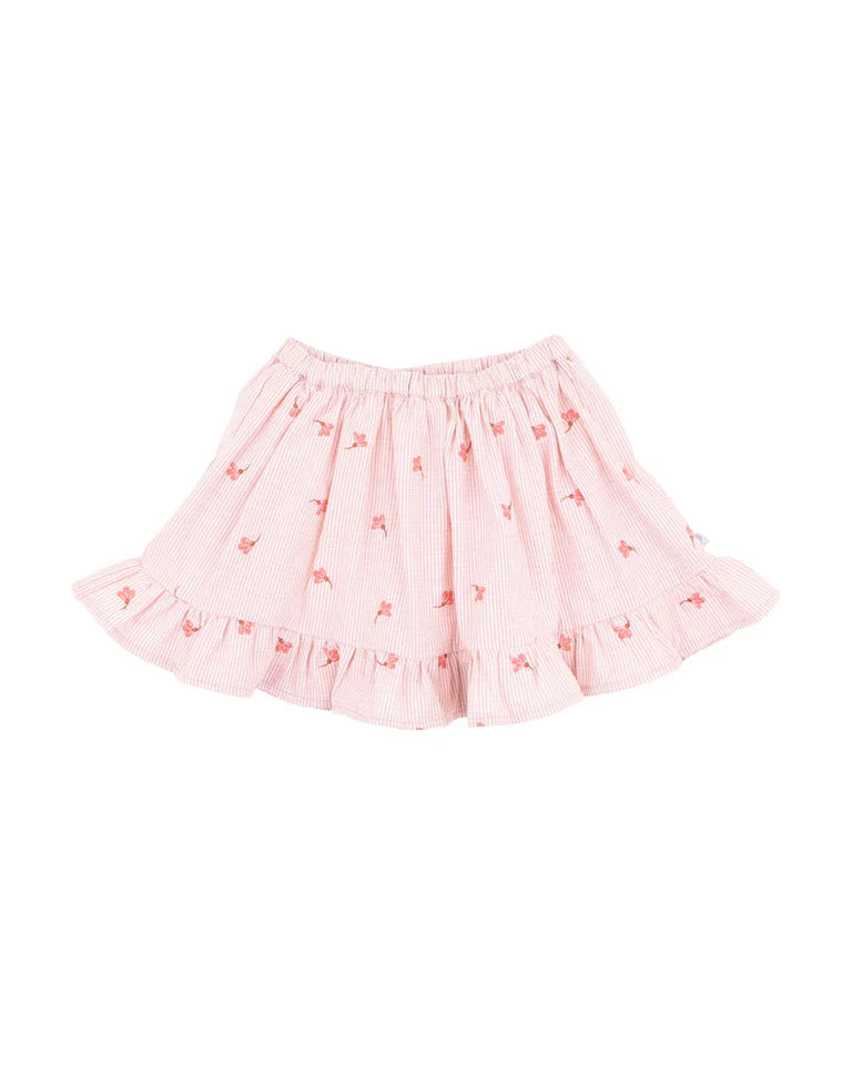 Perfect for twirling, skipping, and sunny-day play, this embroidered frill skirt brings a touch of vintage charm to everyday adventures. With its soft pink stripe, delicate floral embroidery, and built-in shorts, it's made for comfort and whimsy in equal measure. pair it back with the Songbird Embroidered tee for a complete outfit.