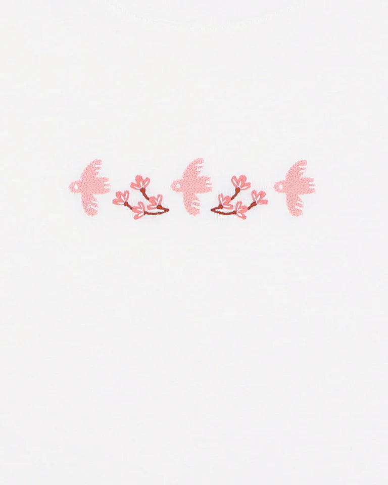 For those sweet, sunny days when comfort is key but style still matters, this soft white tee is the perfect pick. With a delicate pink bird embroidery fluttering across the chest, it's a playful nod to nature, designed for days of imagination and movement. Whether paired with leggings, skirts or shorts, it's an easy staple for everyday adventures.