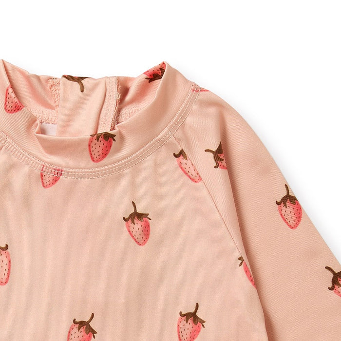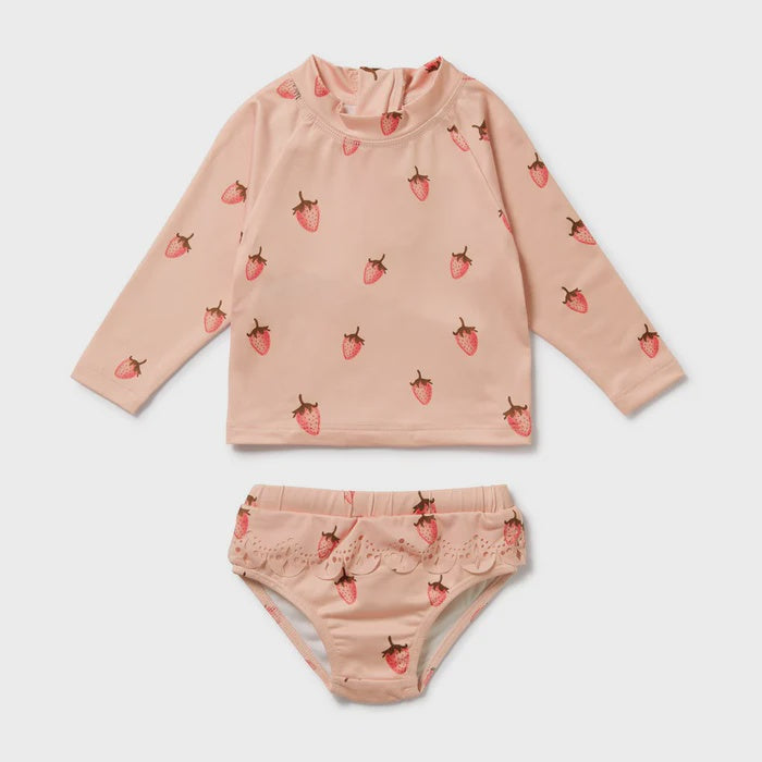This two piece swimsuit is perfect for babies and kids, featuring a beautiful laser cut design. The set includes a long sleeved rash vest with a back zipper opening and a bikini style bottom with an adjustable waist. Made from recycled polyester, our swimwear offers UPF 50+ protection and is suitable for pool and beach activities. Key Features: Made from recycled polyester. Back neck zipper opening with puller. Soft elasticated waistband with adjustable ties. Packaged in a bio-degradable bag. Details: Outer and Lining: 90% recycled polyester, 10% elastane. Machine washable. Made in India.