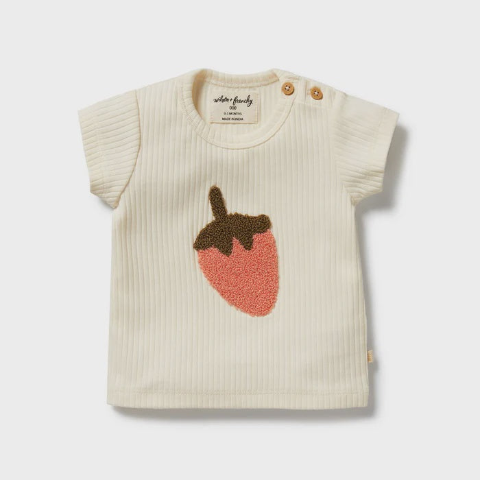 This short-sleeve tee is made from GOTS-certified organic drop needle cotton, offering a soft and breathable feel that's gentle on delicate skin. Featuring a cute strawberry embroidery on the chest and a side button opening for easy dressing, it’s a perfect everyday essential with a touch of charm. Light, comfy, and free from harmful chemicals, it’s designed for warm-weather play and all-day wear. Key Features: Cute strawberry chest embroidery. soft, breathable and gentle on delicate skin. Gentle on sensitive skin. side neck opening with snaps for easy changes. Made with GOTS-certified organic cotton. Sustainably produced. Packaged in a bio-degradable bag. Details: 95% GOTS-certified organic cotton, 5% elastane. Certified by: Ecocert, EGL 212333. Machine washable. Made in India.