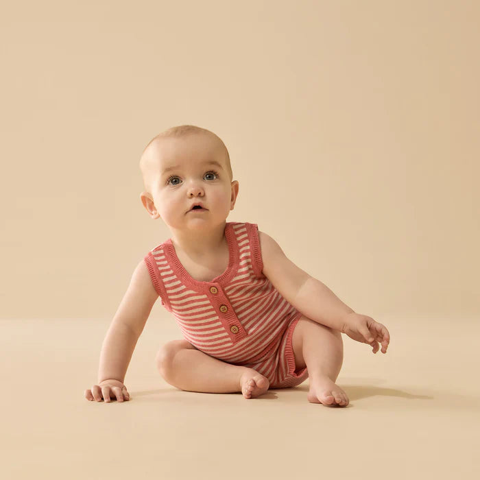 Wrap your little one in comfort and charm with our strawberry swirl organic knitted growsuit. Made from soft, breathable organic cotton, this cosy one-piece features a sweet stripe pattern in soft pink tones. Designed for all-day wear, it offers gentle stretch and a relaxed fit to keep baby comfy during naps, cuddles, and playtime. A perfect blend of style and practicality for your little love. Key Features: Soft waistband is gentle on little tummies. All over stripe design. Made from organic cotton. Wrapped in a bio-degradable bag. Details: 100% GOTS-certified organic cotton. Certified by: Intertek - 1089164. Machine washable. Made in India.