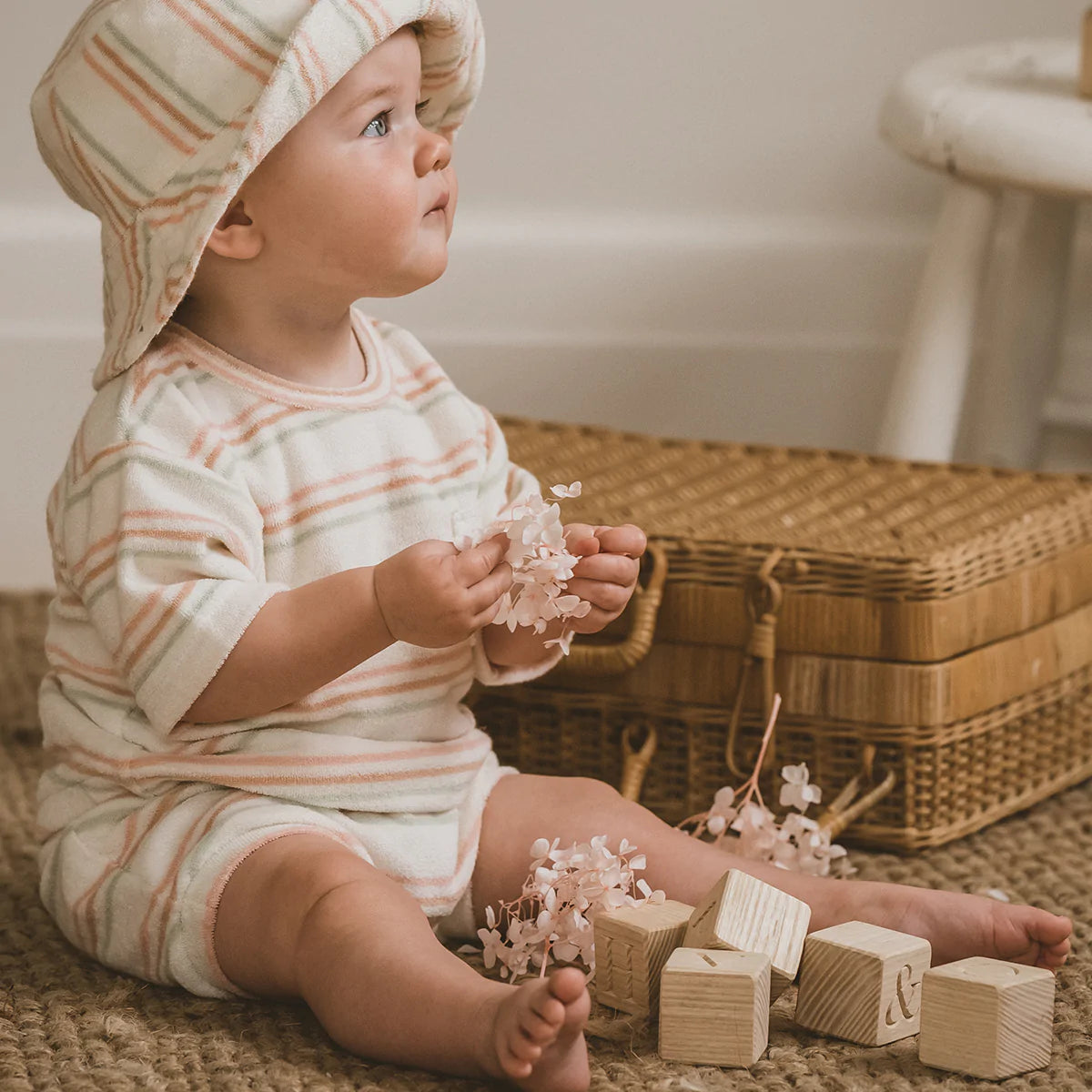 Made with an organic cotton blend terry this striped short sleeve tee is a wardrobe staple with a crew neckline, front chest patch pocket and a back neck opening for ease of dressing. Garment photographed in size 00 (3-6mth).