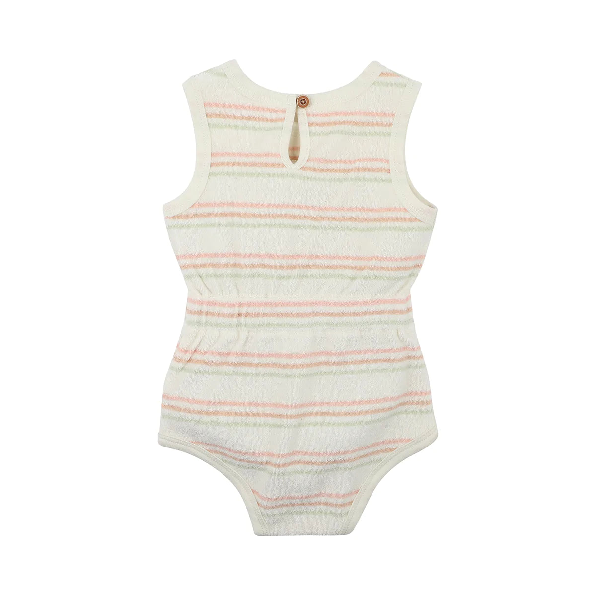 Made with an organic cotton blend striped terry these cute shorts feature an elasticised waist with tie and leg bands for comfort and easy wear. Garment photographed in size 00 (3-6mth).