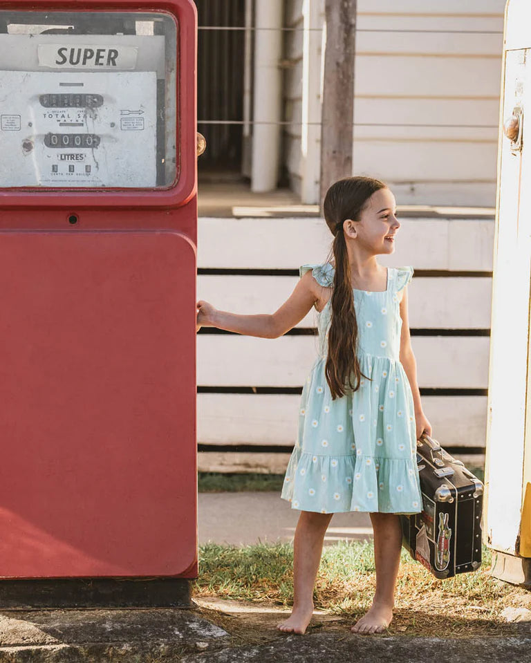 A little meadow moment in dress form. Crafted in a soft sage green with cheerful all-over embroidered daisies, this sweet sundress is a breeze for warm days and picture-perfect outings. With flutter sleeves, a gently gathered skirt, and a pretty frill hem, it's made for twirls and sunshine. The adjustable button straps ensure the perfect fit, while a fully lined finish keeps it comfy all day long. • 100% Cotton • Embroidered daisy fabric • Adjustable button straps • Fully lined • Shirred elastic back for comfort • Dress length from shoulder to hem - 53cm (size 4) • Available in Baby sizing for a coordinated sibling moment