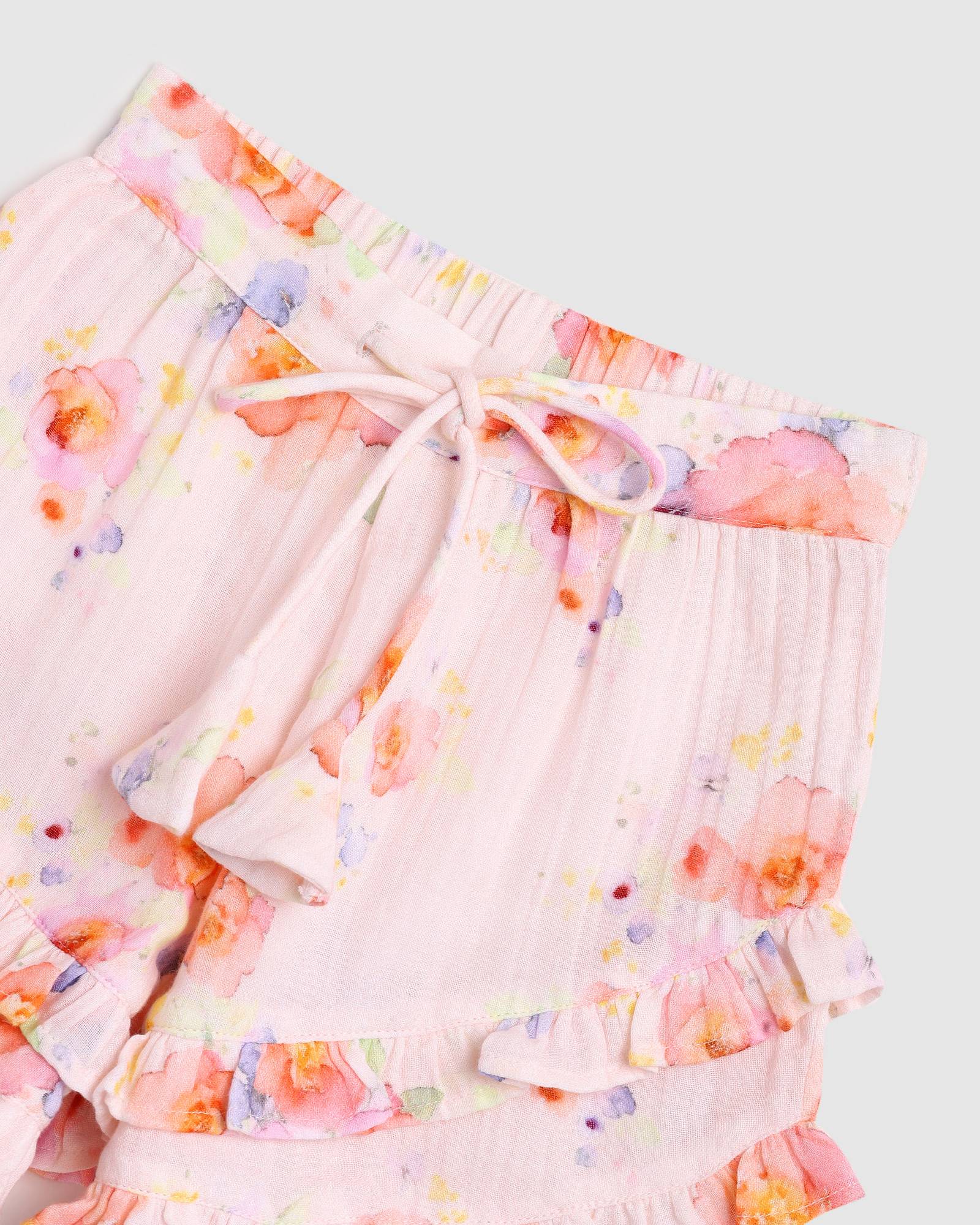 The Stella Shorts in Roses are a perfect combination of comfort and charm, designed for warm-weather adventures. Featuring a colourful floral print and delicate ruffle detailing along the edges, these shorts are as playful as they are stylish. The elasticated waistband and adjustable tie ensure a secure and comfortable fit, making them ideal for active little ones.